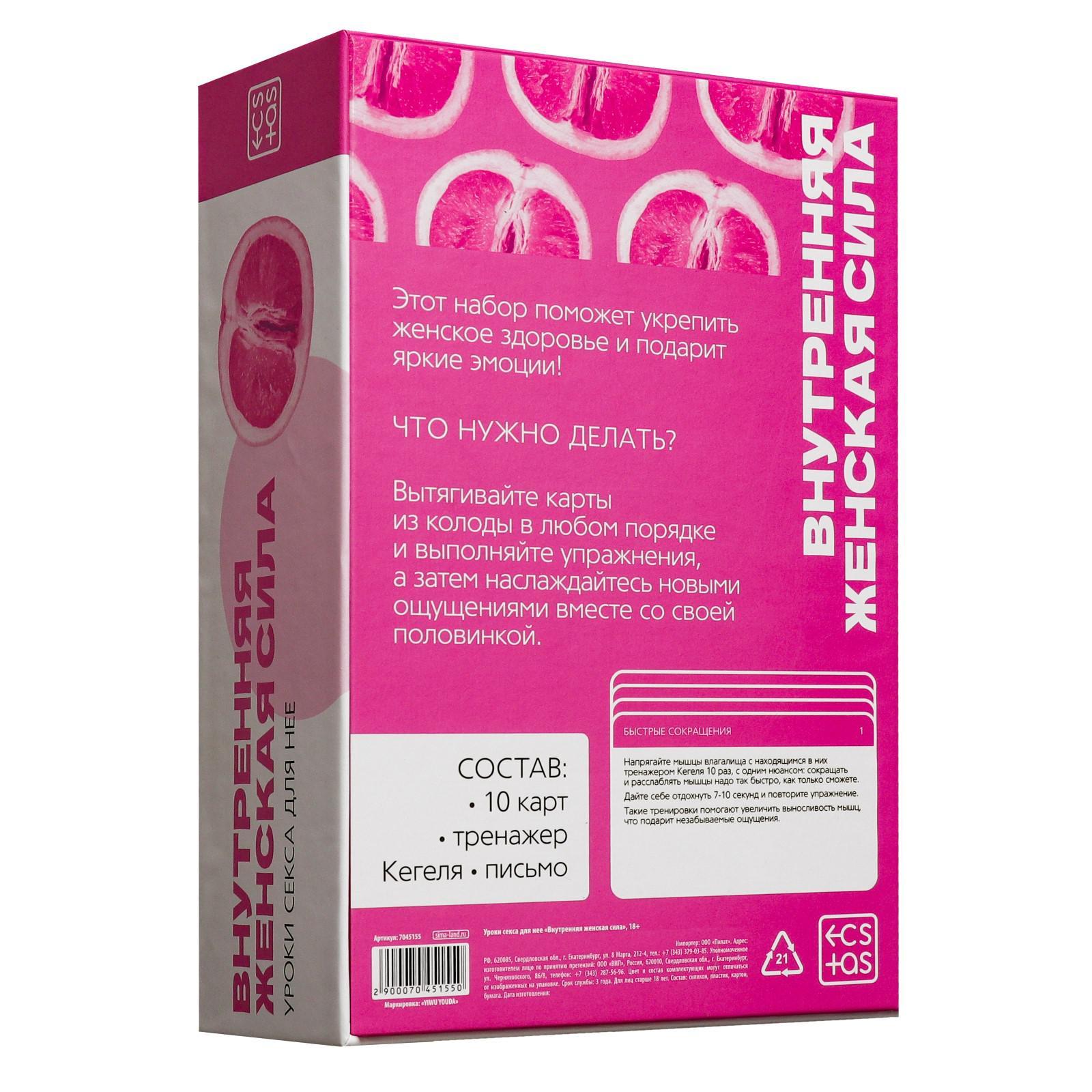 Женский оргазм – это не миф, а наивысшая точка сексуального возбуждения, которую чувствует далеко не каждая девушка. Но достичь всплеска сексуального удовольствия возможно! На помощь придет набор «Внутренняя женская сила». С ним вы натренируете интимные мышцы с помощью тренажера Кегеля, укрепите женское здоровье, подарите яркие эмоции и узнаете о существовании оргазмов.