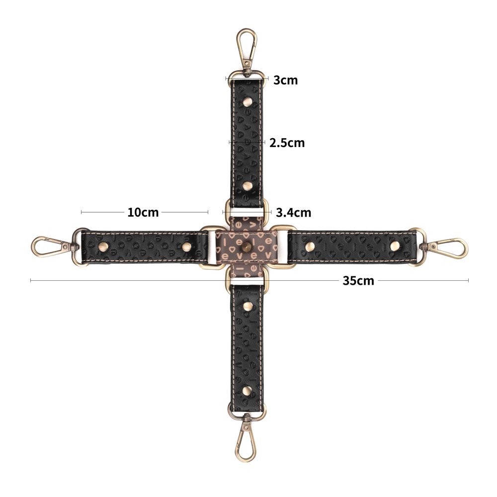 В набор входят наручники, ножные кандалы и оригинальный крестообразный узел , который поднимет ваши ощущения от связывания на новый захватывающий уровень.