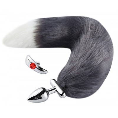 Металлическая анальная втулка со съемным серо-белым хвостиком и пробкой с красным кристаллом.