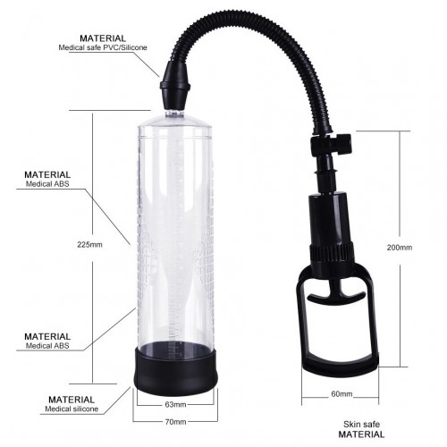 Помпа предназначена для увеличения размеров полового члена и коррекции его формы. Само устройство состоит из прозрачной колбы, шланга с механическим насосом для откачки воздуха и эластичной манжеты. При создании вакуума внутри помпы (вакуум создается с помощью удобного насоса) вы можете видеть, что ваш пенис становится жестким и большим. Особенностью этой помпы является то, что есть возможность отсоединить шланг от колбы без потери давления. Помпа имеет резиновую трубку, соединяющую цилиндр с насосом. Ручной насос сделан по современным технологиям и абсолютно безопасен.
