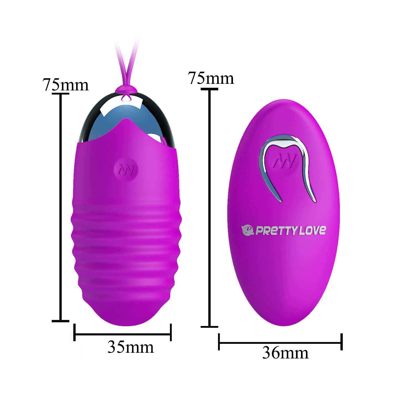 Размеры: длина виброяйца 7,5 см, диаметр 3,5 см: длина пульта 7,5 см, ширина 3,6 см