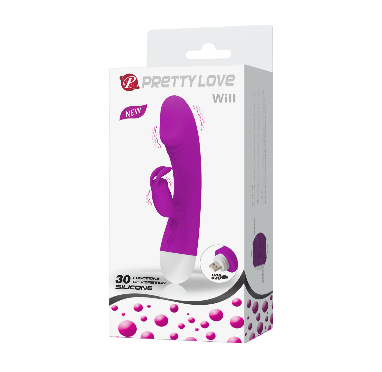 Вибратор Pretty Love изготовлен из высококачественного силикона без содержания фталатов и вредных веществ. Материал очень нежный, шелковистый и приятный на ощупь. Силикон полностью безвредный для здоровья и гипоаллергенный. Выполнен вибратор в классической форме rabbit, а поэтому обладает двумя рабочими стволами. Крупный основной ствол отвечает за стимуляцию влагалищных эрогенных зон, а маленький боковой отросток - за клиторальные ласки. Вагинальный ствол имеет гладкую, нежную поверхность, а также крупную головку, которая находится слегка под изгибом. Во время работы она отлично стимулирует не только влагалищные эрогенные зоны, но и точку G. Клиторальный отросток сделан в виде кролика с длинными гибкими ушками, которые и ласкают клитор интенсивными движениями. Таким образом, с Pretty Love Will Вы получите двойную стимуляцию: вагинальную и клиторальную. Мощный мотор секс-игрушки подарит Вам 30 разнообразных режимов вибрации. Управление происходит с помощью кнопок на корпусе. В вибратор Pretty Love Will встроен USB-порт и имеется провод.